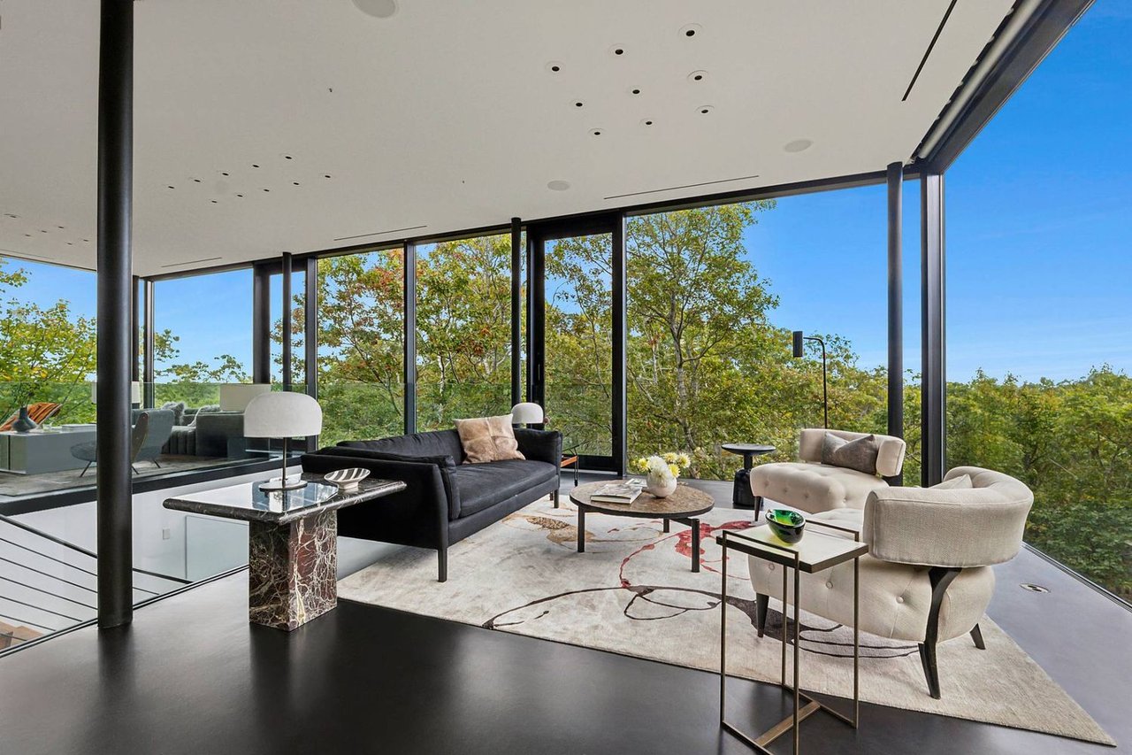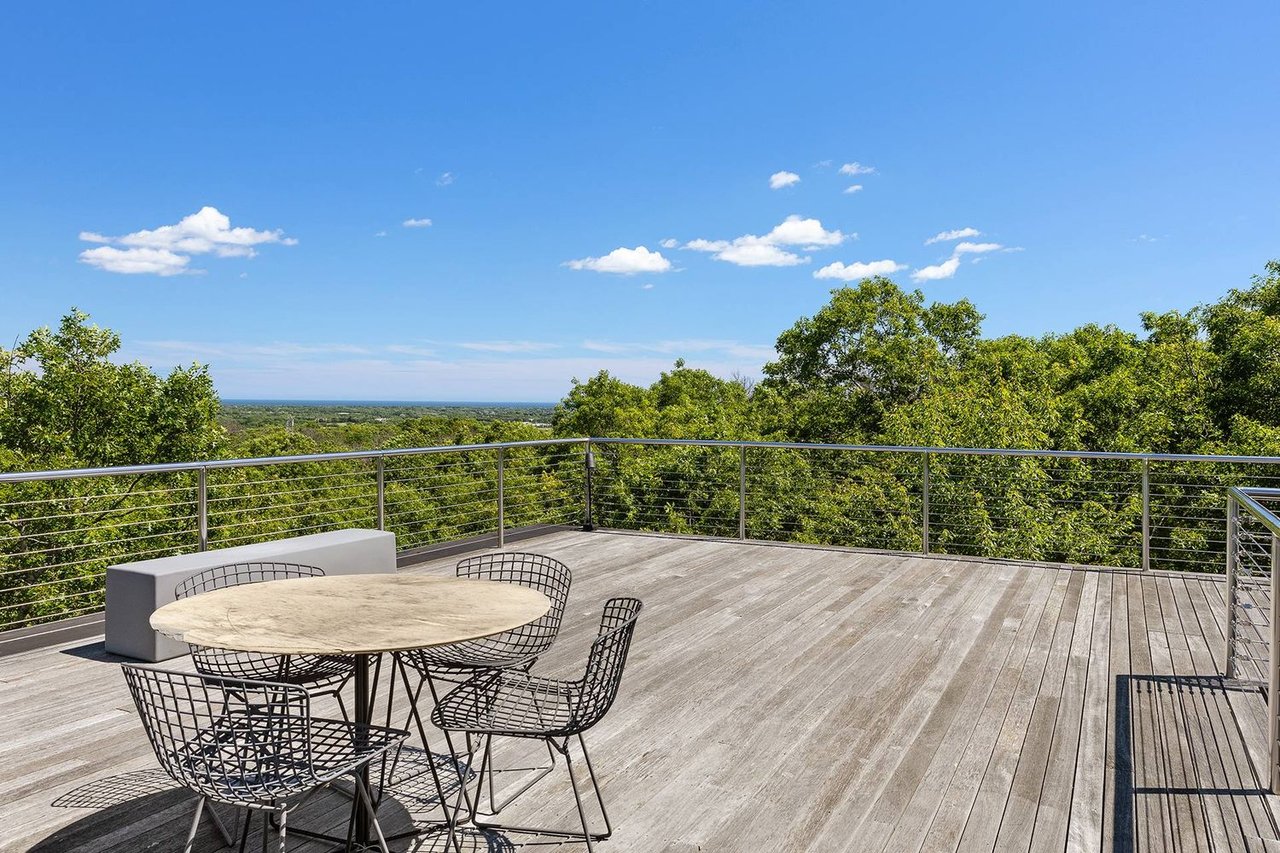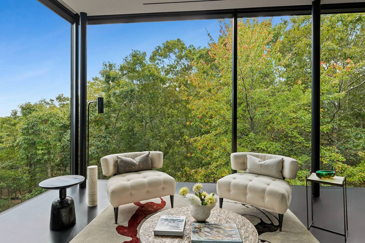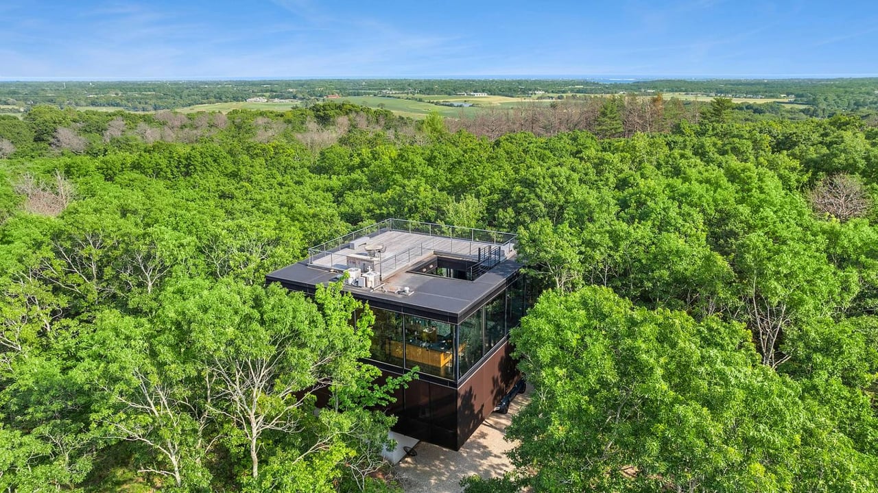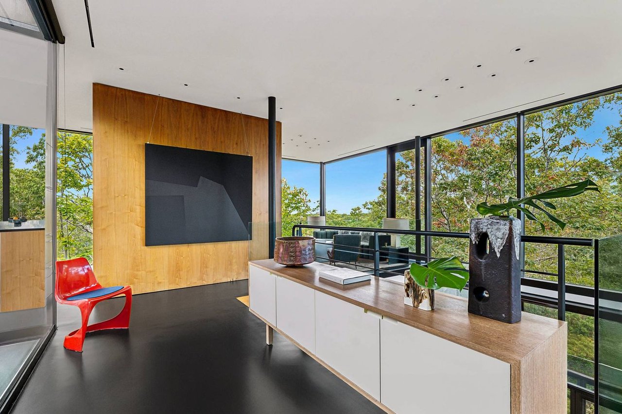 Secreted within a hidden, private Hamptons enclave, minutes from three of the most coveted East End villages, discover "SkyBox," a once-in-a-lifetime opportunity to live in a secluded, published work of modern art, an artist compound like no other. This award-winning Water Mill creation, by the world-renowned team at 1100 Architect, is a hillside sculpture floating effortlessly on close to 10 acres of the highest elevation anywhere in eastern Long Island, affording 360-degree views of lush farmland, the polo fields and the Atlantic Ocean. The home has 4 bedroom suites over three levels of carefully considered details and views from every window. The property also includes a sculptural pool pavilion and a professional clay tennis court that seem to emerge from their natural surroundingsm, plus there is potential opportunity for subdivision. SkyBox, with all its sylvan wonder and jaw-dropping views, refers directly to the Hamptons' history as a retreat for artists and creatives of all kinds. Now you can be one of them. SkyBox spreads out over two floors plus a foyer level, each floor becoming more lavish as you ascend towards the crowning jewel of the rooftop deck. The entry impresses with curved architectural elements, and this floor also encompasses a sophisticated thousand-bottle wine room with integrated tasting table plus laundry and a windowed flex space for a potential gym/4th bedroom. The bedroom level has a spacious primary suite with a separate dressing area and steam spa shower. There is a light-filled landing with a fabulous gallery lounge/media den, plus two spacious ensuite guest bedrooms, currently being used as art studio spaces. This floor is wrapped in an ingenious exterior fiberglass screening, filtering the light gorgeously. The floating staircase takes you up to a truly stunning upper living level, surrounded by floor-to-ceiling windows with motorized sun shades; there are treetop sky & water views in every direction. The central atrium provides dramatic interest, leading to a conversation den, the great room and formal dining. The open kitchen with breakfast nook has built-in cabinetry & luxury appliances. A spiral atrium stair is your portal to the rooftop deck, the ultimate feature of Skybox, with unbelievable panoramic ocean views, a built-in wet bar, and 560 square feet of entertaining space. Other areas of the property include the masterful pool pavilion, also designed by 1100 Architect, beautifully incorporating warm wood with the steel pergola and 15x50 heated Gunite infinity pool and separate spa, evoking a timeless feel of California modernism. There is a chic full pool bath here as well as a separate cabana lounge, outdoor kitchen, & fire pit. Just beyond lies the Har-Tru tennis court with courtside lounge, and a freestanding two-car garage. By far, this is the best value in the Hamptons for improved land with significant architectural pedigree, priced far below replacement value. Potential for further expansion, subdivision or family compound. The location is an East End trifecta: easy access to three prime villages, ocean and bay beaches, and farm fields. Living at SkyBox is like living in a breathtaking work of modern art: now it can be yours.