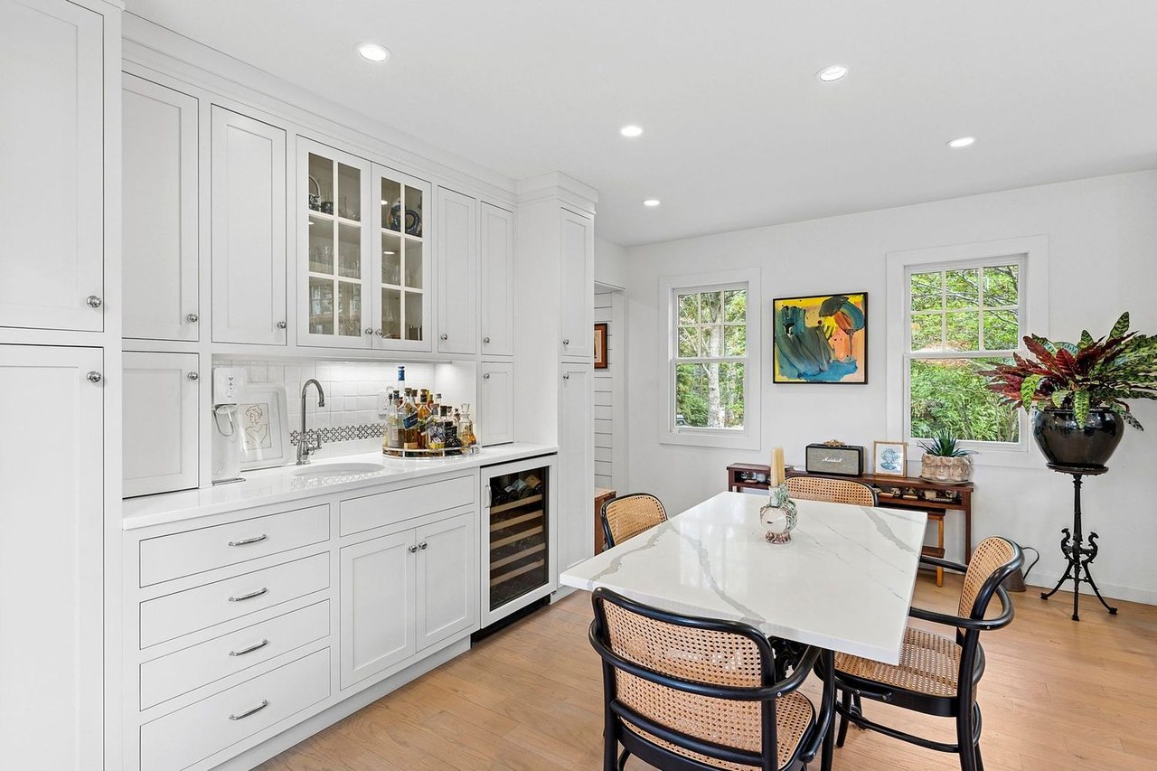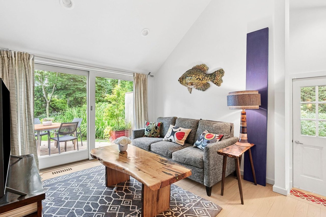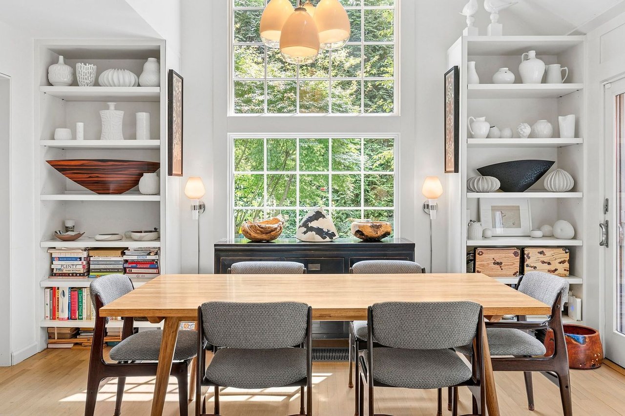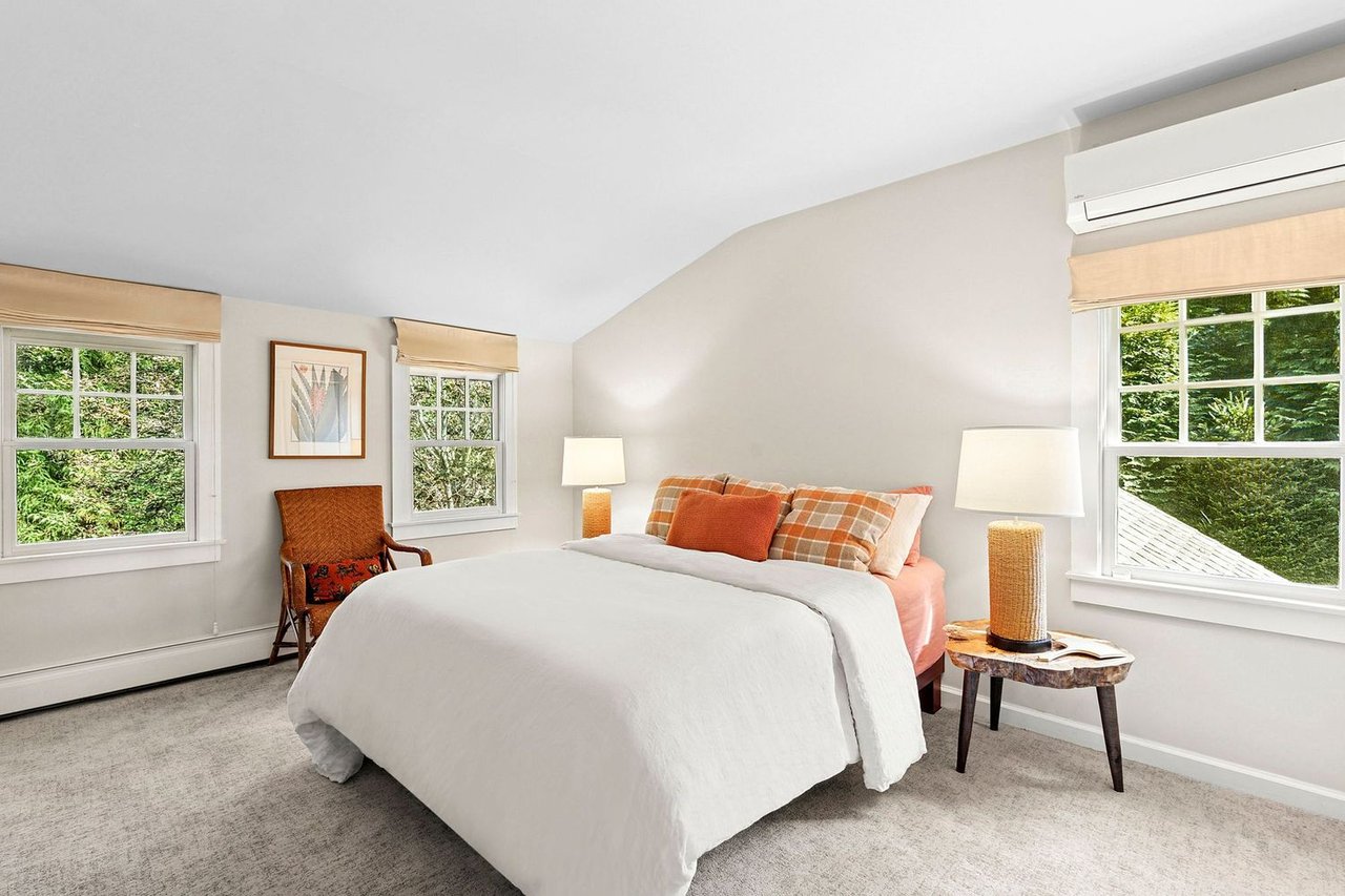 The property has undergone many thoughtful renovations, including a full kitchen revamp and recent renovations of primary and guest bathrooms. Enhancements such as a media den, shiplap walls and transom windows showcase its timeless appeal, and easy expansion opportunities abound. There is a main floor primary suite, and plenty of storage on the lofty lower level, plus a double-height art studio with cathedral ceilings and skylights.