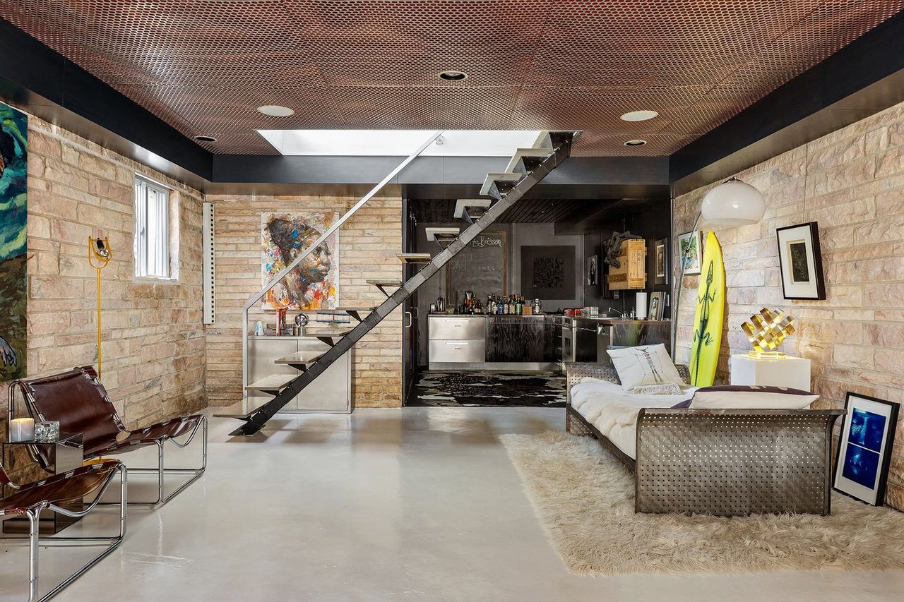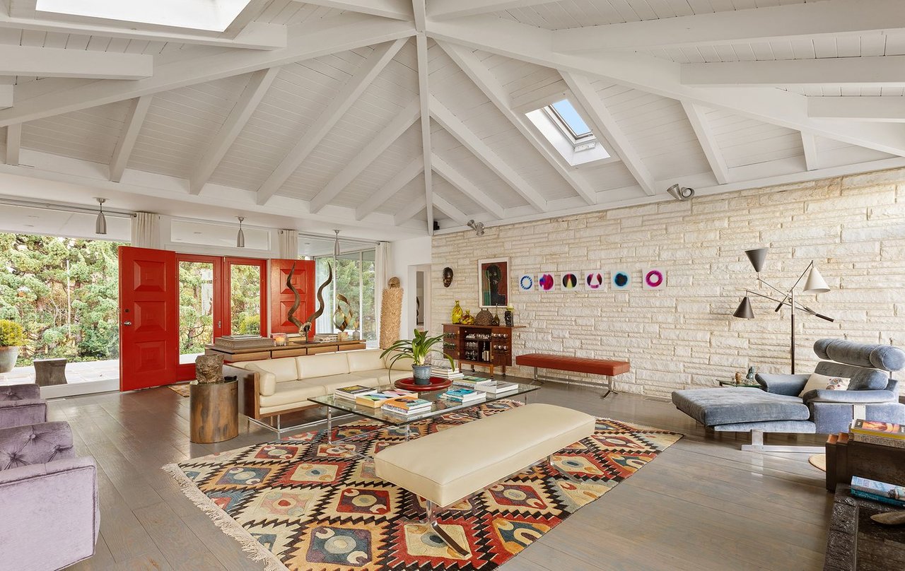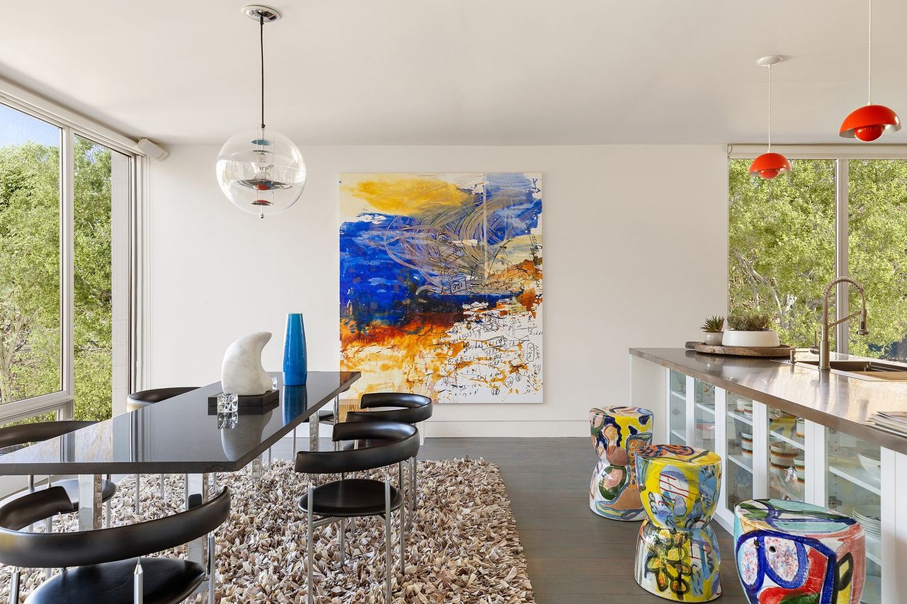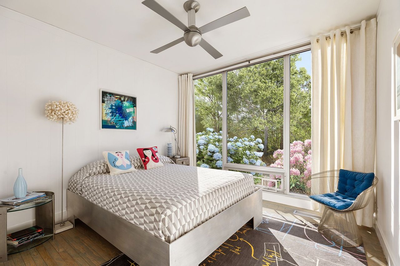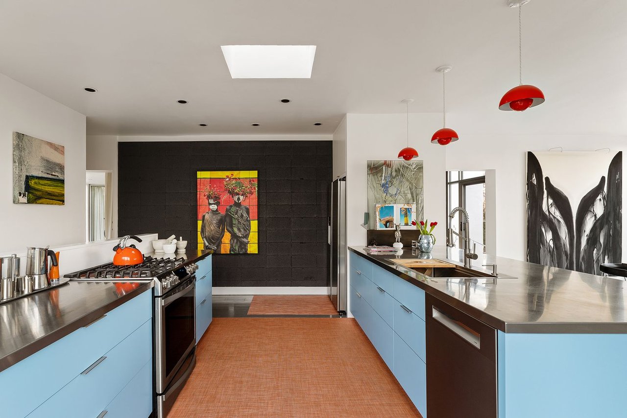 The heart of the home is an expansive great room anchored by a signature concrete fireplace, where massive windows invite the bay views inside as a living work of art, basking in the glow of the five original skylights. The water views continue from the expansive dining room and chef’s kitchen, recently renovated with cool blue handmade cabinetry that vibes with the original architecture. This is a house that breathes; a space celebrated by The New York Times for its effortless cool.