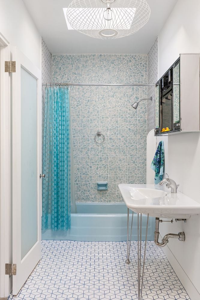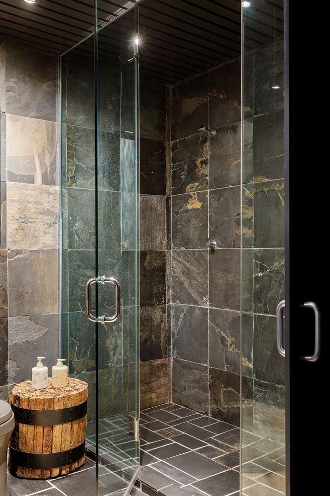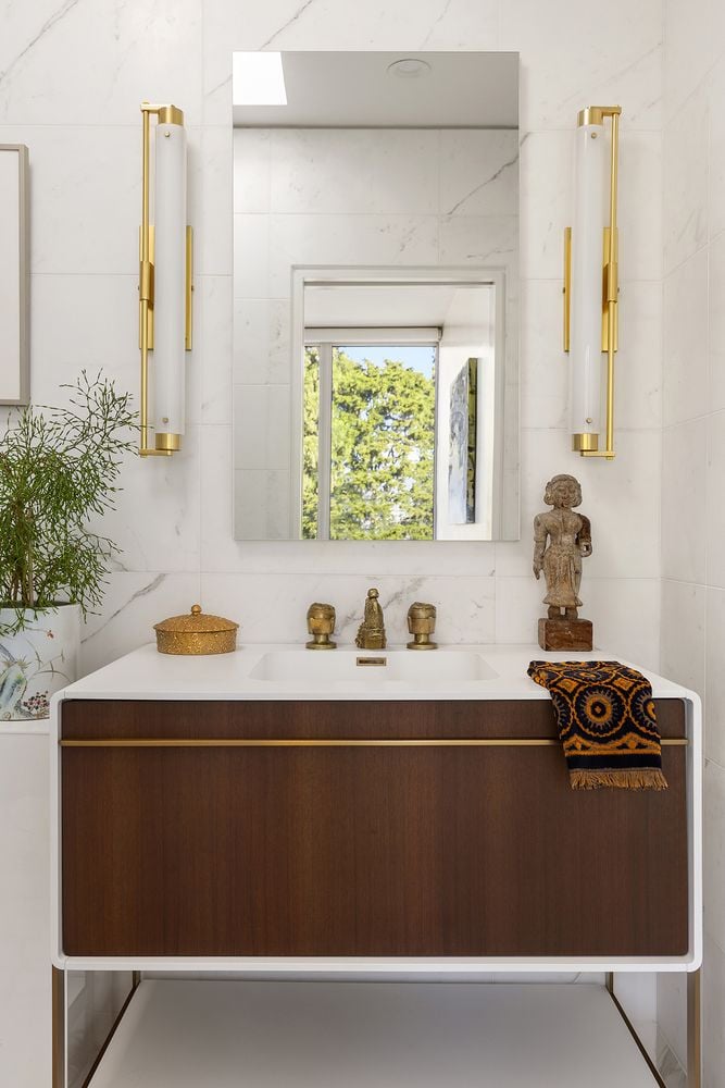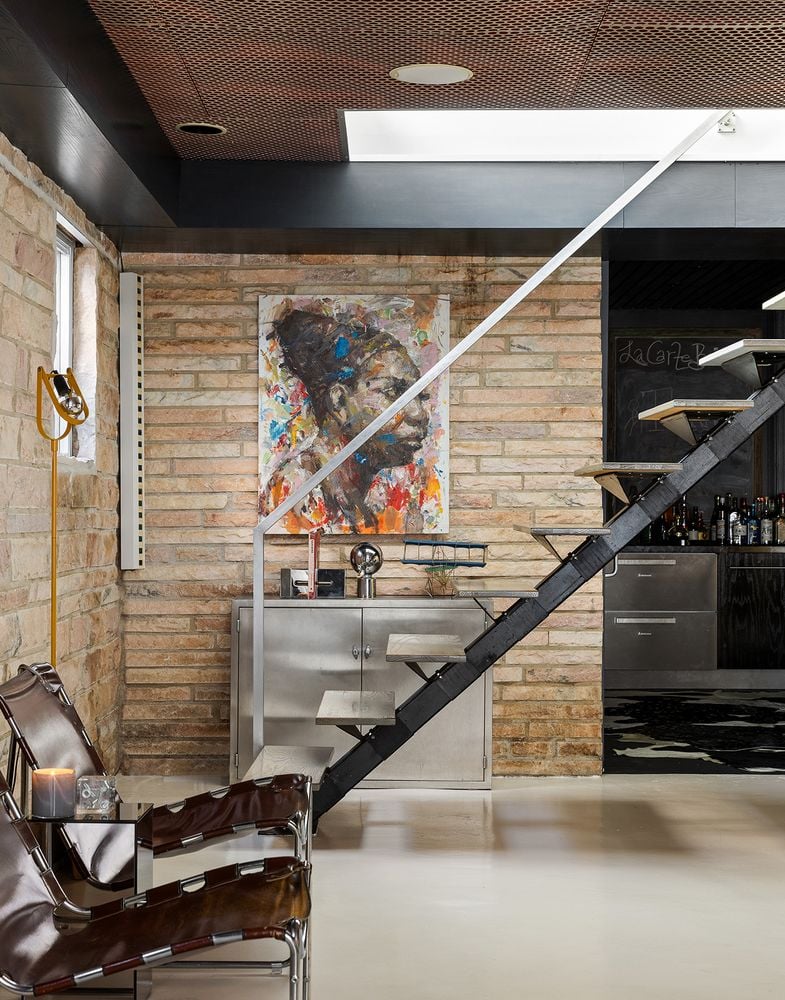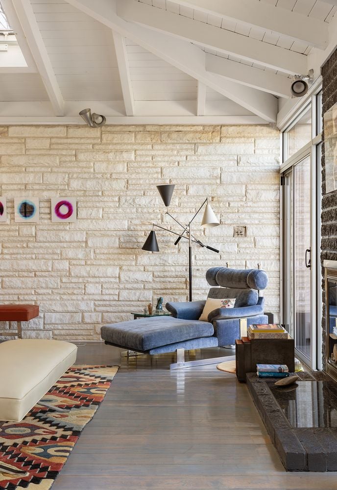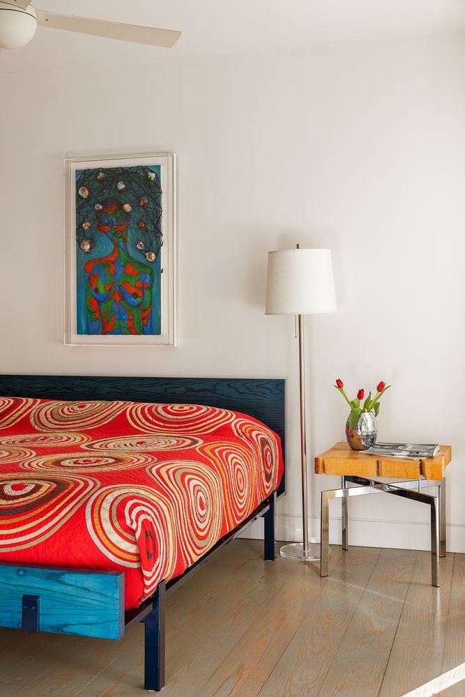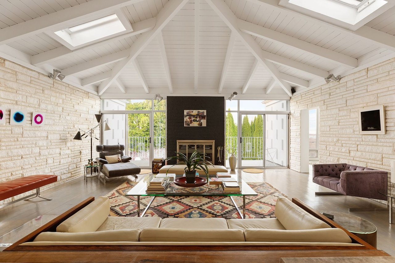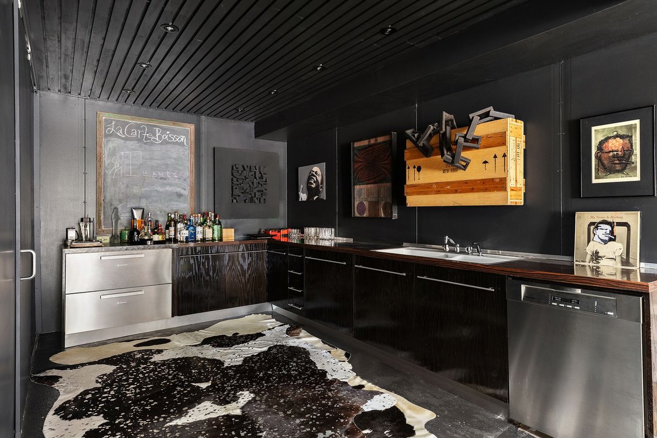 The heart of the home is an expansive great room anchored by a signature concrete fireplace, where massive windows invite the bay views inside as a living work of art, basking in the glow of the five original skylights. The water views continue from the expansive dining room and chef’s kitchen, recently renovated with cool blue handmade cabinetry that vibes with the original architecture. This is a house that breathes; a space celebrated by The New York Times for its effortless cool.