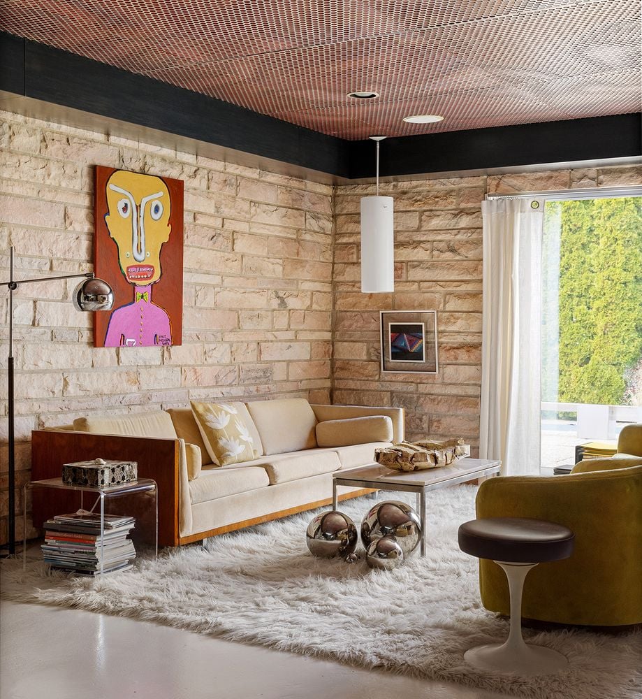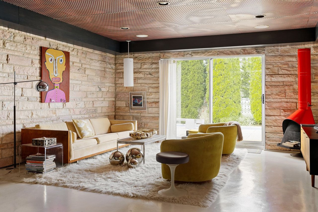 Originally envisioned by architect Bob Gilchrist as a "glass house" pavilion, the residence is a study in the harmony of opposites: texture and light. The 3,000+/- sq. ft. interior is a continuous gallery of light, where soaring mahogany ceilings, finished in a luminous white, float above pale floors and original marble walls. The spirit of the 1960s "Ultramodern" movement has been meticulously curated for the contemporary eye. There is floor-to-ceiling glass everywhere, including the stunning primary suite and 3 guest bedrooms surrounded by green specimen gardens.