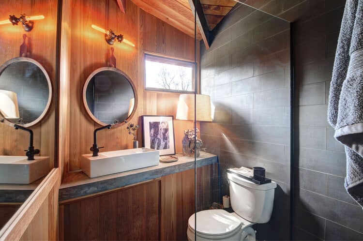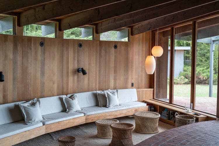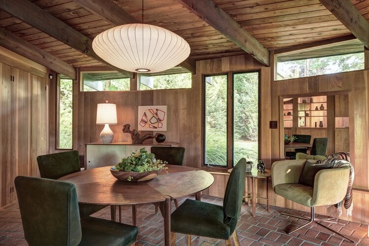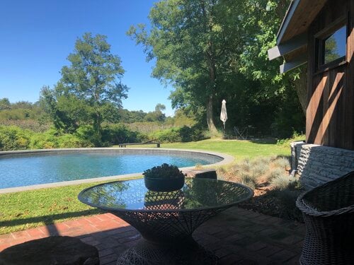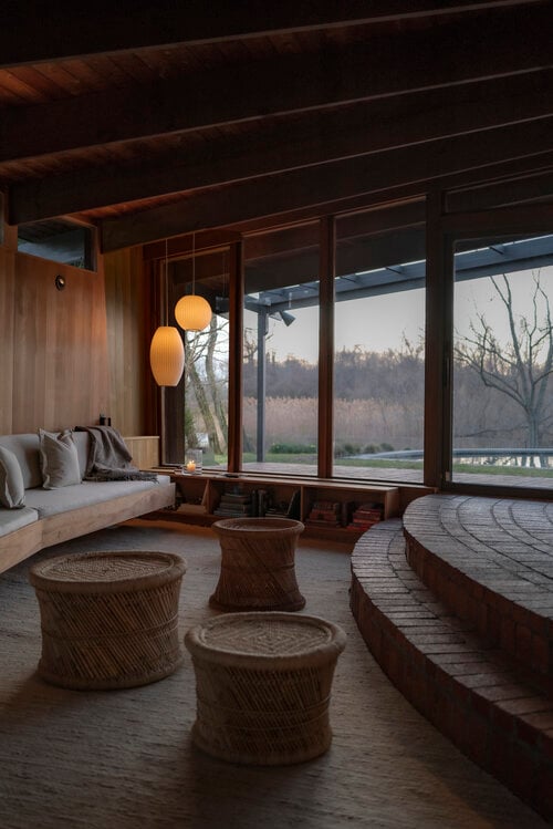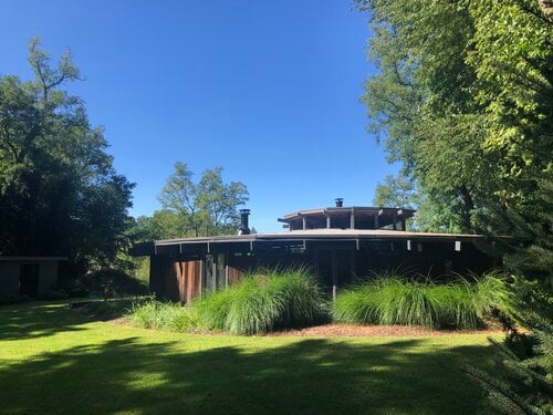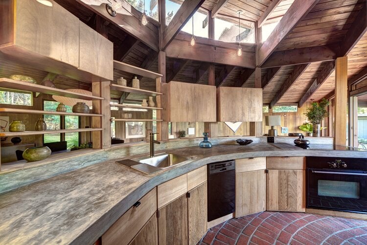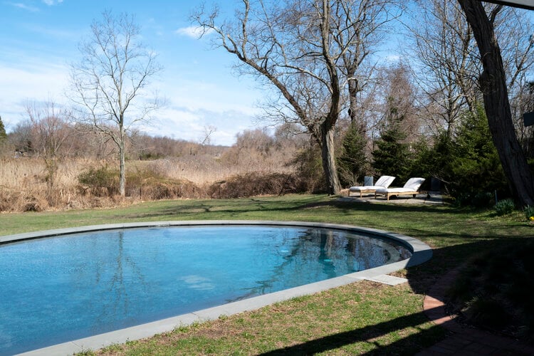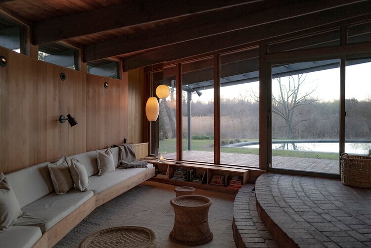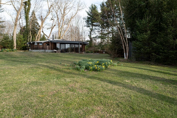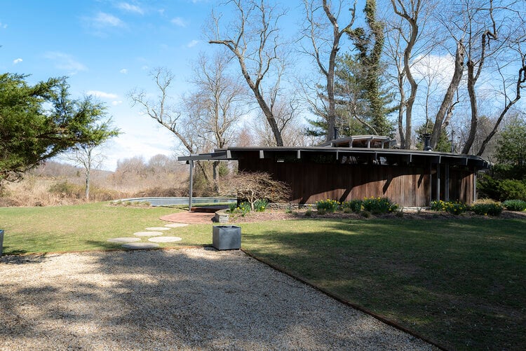 This meticulously restored 1960s cedar-lined modern architectural residence exudes the style of John Lautner and Frank Lloyd Wright. The nautilus-like curves create a comforting and cozy home, and the ambient aroma of the cedar interior is as relaxing as it is unique and memorable. The house has 2 bedrooms and 2 bathrooms, a fireplace, and tons of built-in cabinetry-no space are left unused. Skylights and clerestory windows create that "inside/out-outside in" ambiance. The use of brick and stone throughout the interior further pays tribute to the modernist traditions so in-vogue these days. The waterside heated Gunite pool is the perfect foil for Lily Pond, just beyond. And a cabana completes the picture. The pond is part of the 2.3 acres and the property is currently 2 single and separate lots. There is a lovely outdoor dining/BBQ area with a firepit. A mowed path from the expansive yard to the pond front creates lovely vistas from the house and pool and makes for easy access for kayaking or canoeing. This is an all-seasons house-fantastic getaway in the summer and a warm and cozy wintertime retreat. And the private grounds are continually changing with the seasons. This property would be perfect for the City-dweller looking for space and a very chic place to hang one's hat. It could also be an ideal purchase for someone who owns a larger home on the South Fork or elsewhere on Shelter Island or on the North Fork that rents for the summer. They would have this very cool place to spend the summer while their other home is rented. There is room for expansion. All systems in the house are new. Located about 3 minutes from the South Ferry (Sag Harbor-bound) and about 6 minutes from the North Ferry (Greenport and North Fork-bound). Exclusively listed by CeeJackTeam. $1.695m.